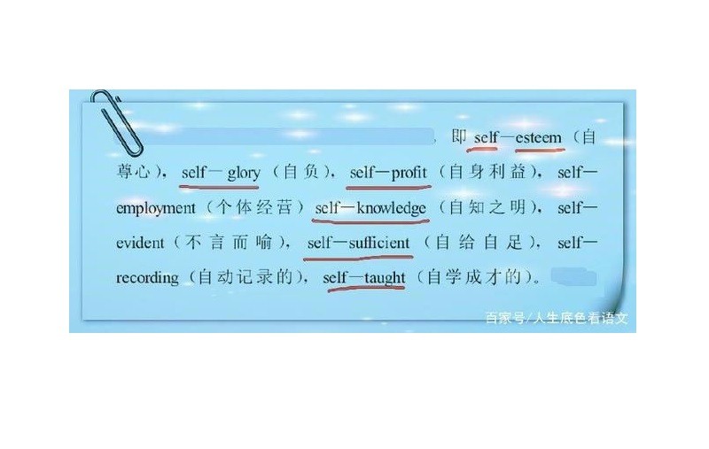 词的前缀和后缀可以和词根一起构成意义丰富、具体的各种词类的单词,比如前缀self-,可以加在名词、形容词或分词的前面,构成更多有趣的词如:
